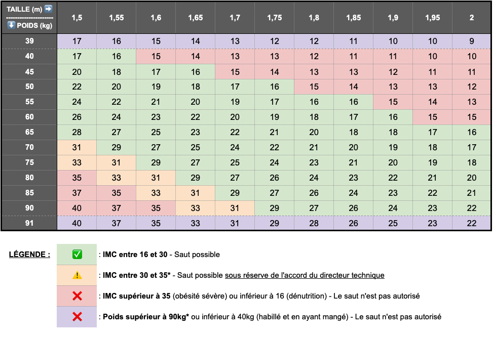 Au-delà des aspects techniques de la voile, le confort et la sécurité pendant le saut sont des éléments cruciaux. Nous avons établi une double limite : un poids maximum de 90 kg (habillé, chaussé et après avoir mangé) ET un Indice de Masse Corporelle (IMC) ne dépassant pas 35. Ces deux conditions sont complémentaires et indissociables pour un saut en parachute.